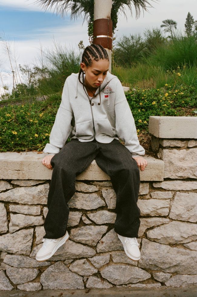 • Fleece Zip Hoodie มอบความสบายในเนื้อผ้าน้ำหนักหนัก พร้อมการฟอกสีดำสไตล์วินเทจ ซิปสองทาง และกราฟิกคอลแลปส์