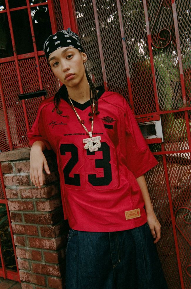 • Levi’s® x Jordan Football Jersey ถ่ายทอดพลังสปอร์ตในทรงครอปบ็อกซี ผลิตจากโพลีเอสเตอร์ผิวเงา ตัดกับแผงสีแดงแบบด้านและแบบเงาพร้อม jock tag แบบคอลแลปส์ที่ผสานโลโก้ Wings อันเป็นเอกลักษณ์ของ Jordan Brand เข้ากับโลโก้ Levi’s® timeless two-horse