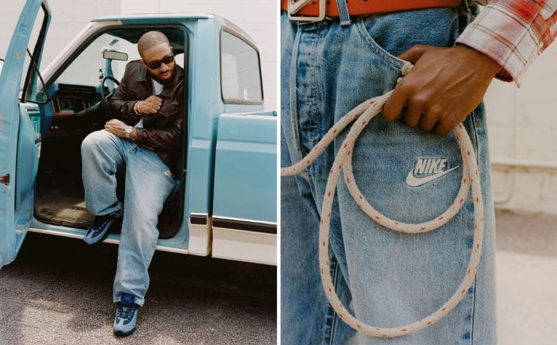 Trucker Jacket ยังคงโครงสร้าง Type II อันเป็นเอกลักษณ์ เสริมดีเทล selvedge ภายใน และลายปักโลโก้ Nike ขนาดใหญ่ด้านหลัง ขณะที่กางเกง Baggy Jean มาพร้อมทรง Oversize ที่ออกแบบมาให้เข้ากับรองเท้าในคอลเลกชันอย่างลงตัว