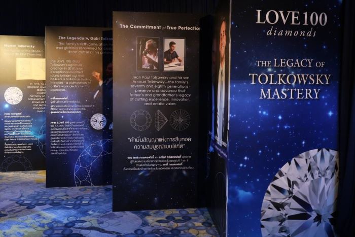 ซึ่งงานในครั้งนี้ได้รับเกียรติจาก Mr. Jean Paul Tolkowsky (ฌอง พอล ทอลคอฟสกี้) ทายาทรุ่น 7 และ Mr. Arnaud Tolkowsky (อาโนลด์ ทอลคอฟสกี้) ทายาทรุ่นที่ 8 จากแบรนด์ LOVE 100 DIAMONDS บินตรงมาร่วมต้อนรับแขกผู้มีเกียรติและสื่อมวลชนด้วยตนเอง พร้อมบอกเล่าเรื่องราวการเดินทางกว่า 200 ปีของตระกูลทอลคอฟสกี้ ผู้พลิกมาตรฐานใหม่ให้กับการเจียระไนเพชรของโลก และจุดกำเนิดของเพชร 100 เหลี่ยมที่งดงามไร้ที่ติ ผ่านรูปแบบนิทรรศการร่วมสมัย นอกจากนี้ยังได้เปิดตัวคอลเลคชั่นเครื่องประดับเพชรที่ได้รับแรงบันดาลใจจากความเจิดจรัสของหมู่ดาวบนท้องฟ้า ที่รังสรรค์โดย Loretta Baiocchi (ลอเร็ตต้า ไบโยคคี่) จิวเวลรี่ดีไซเนอร์ชื่อดังระดับโลก ในฐานะผู้อำนวยการด้านการสร้างสรรค์ของแบรนด์ LOVE 100 DIAMONDS รวมไปถึงคอลเลคชั่นเครื่องประดับเพชรที่ถูกออกแบบขึ้นพิเศษเฉพาะสำหรับประเทศไทยภายใต้ความพิถีพิถันด้านดีไซน์โดย JUBILEE DIAMOND อีกด้วย