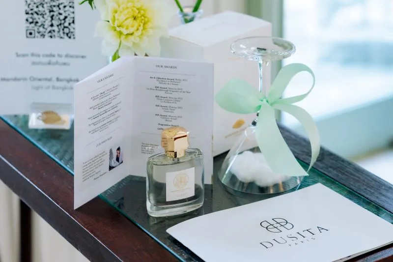 ความร่วมมือกับ Parfums Dusita โรงแรมขอนำเสนอ Light of Bangkok น้ำหอมกลิ่นพิเศษ สร้างสรรค์โดย คุณ พลอย ภิสสรา อุมะวิชนี ผู้ก่อตั้งแบรนด์ Parfums Dusita นักปรุงน้ำหอมชาวไทยชื่อดังในกรุงปารีส ด้วยส่วนผสมหลักจากธรรมชาติ ให้กลิ่นหอมที่สะท้อนถึงความอบอุ่นและการต้อนรับอันเปี่ยมด้วยไมตรีจิตอย่างสง่างามของโรงแรมแมนดาริน โอเรียนเต็ล กรุงเทพฯ กลิ่นของตะไคร้ มะลิ กระดังงา และไม้จันทน์ ที่ชวนให้นึกถึงสถาปัตยกรรมและบรรยากาศได้อย่างแท้จริง