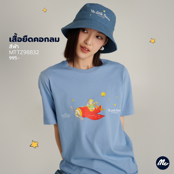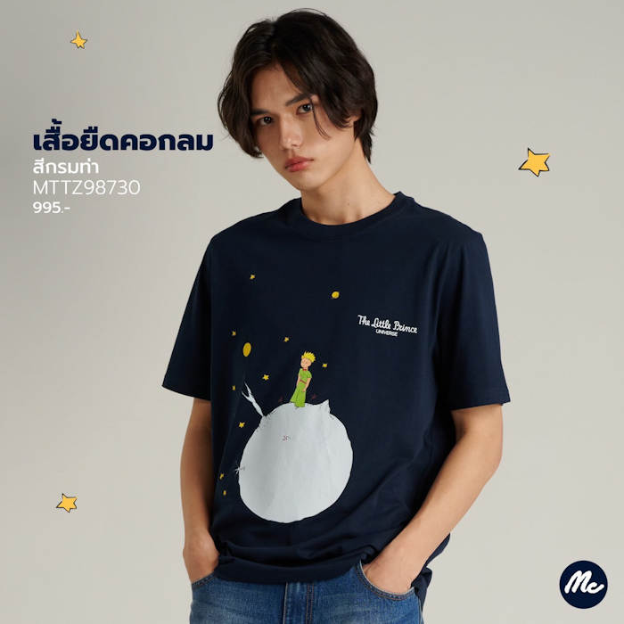 พบกับไอเทมหลากหลาย ได้แก่ เสื้อยืดคอกลมทรงคลาสสิค ลวดลายเจ้าชายน้อยในเรื่องราวต่างๆ สีเสื้อมีความมินิมอล ผลิตด้วยผ้าคอตตอน 100% สัมผัสนุ่มสบาย ระบายอากาศได้ดี เทคนิคการพิมพ์ออฟเซททั้งด้านหน้าและด้านหลัง ใส่แมทช์กับกางเกงยีนส์หรือขาสั้นตัวโปรด