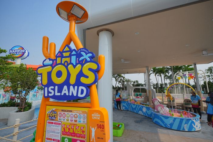 6. Toys Island (ทอยส์ ไอส์แลนด์) โซนของเล่นน้ำ เสริมสร้างพัฒนาการด้านต่างๆของเด็กๆ ที่เน้นความปลอดภัยตามมาตรฐานระดับสูงสุดของโลก อาทิ ของเล่นต่อรางน้ำ แกะบล็อคอัญมณี โต๊ะจำลองงานช่าง ห้องครัวจำลอง อุปกรณ์เล่นทราย และเครื่องดนดรีสร้างสีสันความสนุกมากมาย