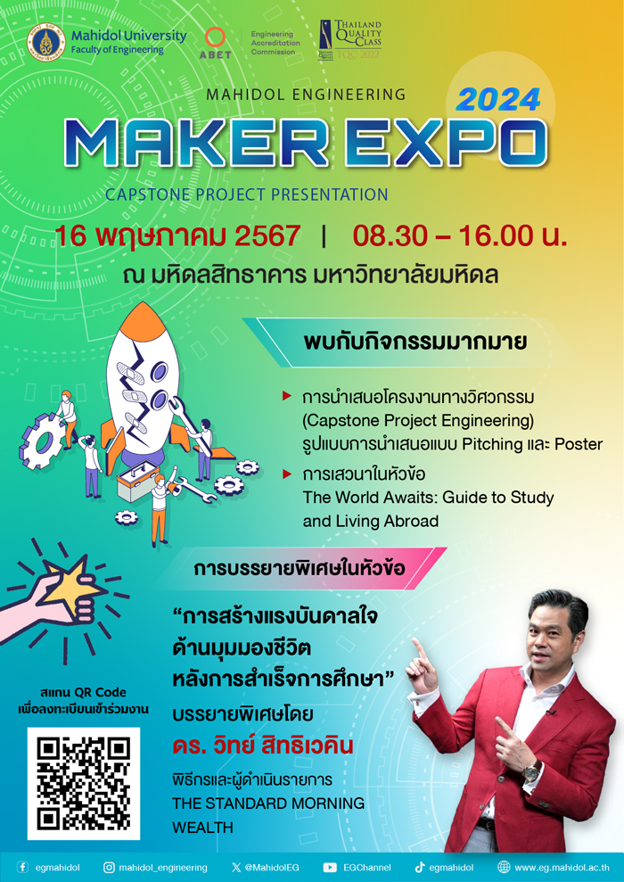 คณะวิศวกรรมศาสตร์ มหาวิทยาลัยมหิดล เปิดเวที Mahidol Engineering Maker Expo 2024 “Capstone Project Presentation” โชว์ผลงานโครงงานวิศวกรรมของนักศึกษาชั้นปีที่ 4 เพื่อส่งเสริมการแลกเปลี่ยนองค์ความรู้และงานวิจัย รวมถึงเผยแพร่ผลงานวิจัยนวัตกรรมที่ตอบโจทย์การสร้างประโยชน์ต่อสังคม เศรษฐกิจ และสิ่งแวดล้อม ที่ครอบคลุมมากถึง 5 คลัสเตอร์ ไม่ว่าจะเป็น วิศวกรรมชีวการแพทย์, วิศวกรรมดิจิทัล, วิศวกรรมเพื่อความยั่งยืน, วิศวกรรมโลจิสติกส์และระบบราง และวิศวกรรมเคมีประยุกต์ การประกาศผลและมอบรางวัล พร้อมด้วยการเสวนา “The World Awaits: Guide to Study and Living Abroad” และการบรรยายพิเศษ “การสร้างแรงบันดาลใจด้านมุมมองชีวิต หลังการสำเร็จการศึกษา” โดย ดร.วิทย์ สิทธิเวคิน กูรูด้านเศรษฐกิจ และการลงทุน พิธีกรรายการ The Standard Morning Wealth ในวันที่ 16 พฤษภาคม 2567 ตั้งแต่เวลา 8.30-16.00 น. ณ มหิดลสิทธาคาร มหาวิทยาลัยมหิดล