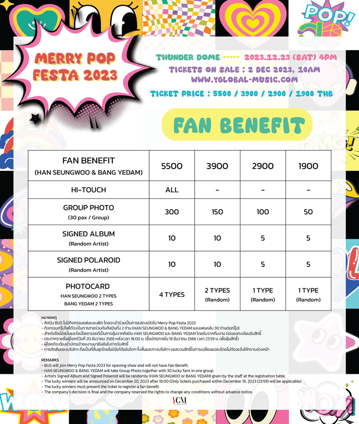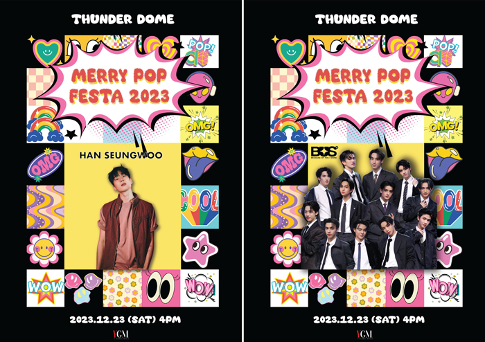 สำหรับงาน MERRY POP FESTA 2023 ทางผู้จัด YGLOBAL อยากให้เป็นคอนเสิร์ตที่แฟนๆ ชาวไทยของทั้ง 3 ศิลปินมาร่วมร้อง ร่วมเชียร์ และสนุกไปกับโชว์ทุกโชว์ และติดตามความพิเศษมากมายที่เหล่าศิลปินเตรียมขนมามอบให้กับแฟนๆ ทุกคน และไม่ใช่แค่ผู้จัด ทั้ง 3 ศิลปินไม่ว่าจะเป็น ฮันซึงอู, บังเยดัม และหนุ่มๆ วง บัส ทั้ง 12 คน ไม่ว่าจะเป็น อลัน-พศวีร์ ศรีอรุโณทัย, มาร์ค-กฤษณ์ กัญจนาทิพย์, ขุนพล-ปองพล ปัญญามิตร, ฮาร์ท-ชุติวัฒน์ จันเคน, จินวุค คิม, ไทย-ชญานนท์ ภาคฐิน, เน็กซ์-ณัฐกิตติ์ แช่มดารา, ภู-ธัชชัย ลิ้มปัญญากุล, คอปเปอร์-เดชาวัต พรเดชาพิพัฒ, เอเอ-อชิรกรณ์ สุวิทยะเสถียร, จั๋ง-ธีร์ บุญเสริมสุวงศ์ และ ภีม-วสุพล พรพนานุรักษ์ ก็เตรียมพร้อมที่จะมามอบความสุขผ่านโชว์ต่างๆ เป็นพิเศษเพื่อเป็นของขวัญในวันคริสมาสต์ปีนี้ให้กับแฟนๆ ชาวไทยทุกคนเช่นกัน
