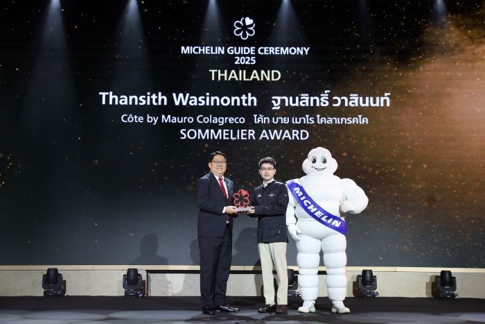 MICHELIN Guide Sommelier Award เป็นรางวัลที่มอบให้กับ “ซอมเมอลิเยร์” หรือผู้เชี่ยวชาญด้านไวน์ที่มีคุณสมบัติโดดเด่น โดยให้บริการอย่างมืออาชีพ และมีความชำนาญในการให้คำแนะนำเกี่ยวกับไวน์ชนิดต่าง ๆ รวมถึงการจับคู่ไวน์กับเมนูอาหาร เพื่อให้ลูกค้าได้รับประสบการณ์ด้านอรรถรสสูงสุด โดยผู้ได้รับรางวัลประจำปี 2568 คือ ฐานสิทธิ์ วาสินนท์ จากร้าน โค้ท บาย เมาโร โคลาเกรคโค ณ โรงแรมคาเพลลา กรุงเทพ ด้วยประสบการณ์ 4 ปี ในสายงานด้านซอมเมอลิเยร์ คุณฐานสิทธิ์มีความเป็นมืออาชีพและรู้จริงในการนำเสนอและแนะนำไวน์ การให้คำแนะนำอย่างมั่นใจแต่สุภาพอ่อนน้อมอยู่ในที ทำให้ลูกค้าเพลิดเพลินไปกับการลิ้มลองรสชาติไวน์อย่างได้อรรถรสเต็มเปี่ยม