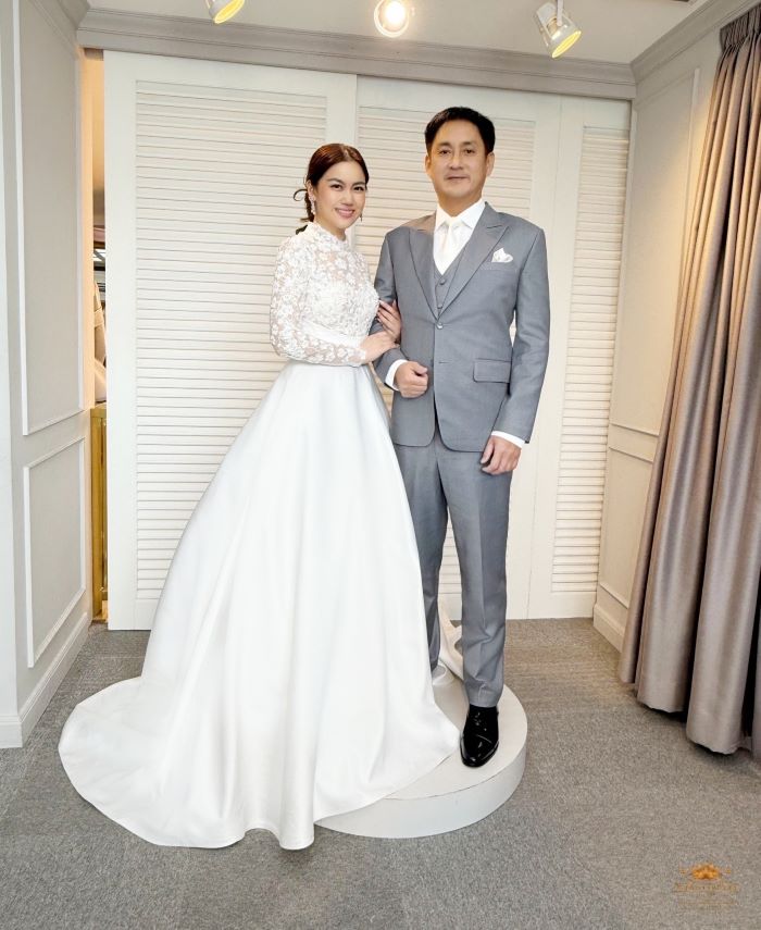 เปิดตัวด้วยชุดทำบุญพิธีไทยเช้าวันนี้ มาในลุคชุดไทยศิวาลัยสีขาวดอกบัวหลวง ซึ่งสะท้อนถึงความงดงามของวัฒนธรรมไทยและความประณีตในงานออกแบบระดับสูง ชุดนี้ถูกตัดเย็บด้วยผ้าไหมทอมือ 4 เส้น คุณภาพเยี่ยม บรรจงปักคริสตัลสีขาวและสีเงินทั่วทั้งชุดในลวดลายดอกบัวเลื้อยที่แสดงถึงความงามอันอ่อนช้อยแบบไทย สไบได้รับการตกแต่งด้วยงานปักละเอียดลออโดยใช้ ปัด ป้อง และคริสตัลสวารอฟสกี้ เพิ่มความโดดเด่นให้ชุดอย่างสมบูรณ์แบบ เสริมลุคเจ้าสาวให้ดูงดงามด้วยเครื่องประดับไทยฝีมือช่างทองโบราณ ได้แก่ เข็มขัดทอง และกำไลข้อมือ ส่วนสร้อยคอ ต่างหู และแหวน คุณหมิงเลือกใช้จิวเวลรี่เพชรแท้ทั้งหมด เป็นลุคที่ดูโดดเด่นและงดงามมากทีเดียว