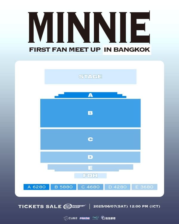 MINNIE ถือเป็นหนึ่งใน ‘แทกุกไลน์’ ที่สร้างชื่อในวงการ K-POP ได้อย่างสวยงาม ด้วยเสียงร้องละมุน ความสามารถด้านการแต่งเพลง และคาแร็กเตอร์สดใสที่ใครก็หลงรัก จนสามารถครองใจแฟนคลับทั่วโลก วันนี้ถึงเวลาแล้วที่แฟนคลับชาวไทยจะได้สัมผัสโมเมนต์สุดพิเศษที่จะอัปเลเวลความใกล้ชิดกว่าที่เคย พร้อมโชว์สุดเอ็กซ์คลูซีฟที่เตรียมมาเพื่องานนี้โดยเฉพาะ รวมไปถึงร่วมลุ้นเบเนฟิตสุดฟิน ไม่ว่าจะเป็น ลุ้น Hi-Touch, ลุ้นรับ Sign Poster, ลุ้นรับ Sign Album, ลุ้นถ่าย Group Photo และทุกที่นั่งจะได้รับ BKK Only Photo Card เก็บไว้เป็นที่ระลึกอีกด้วย