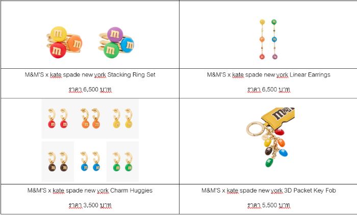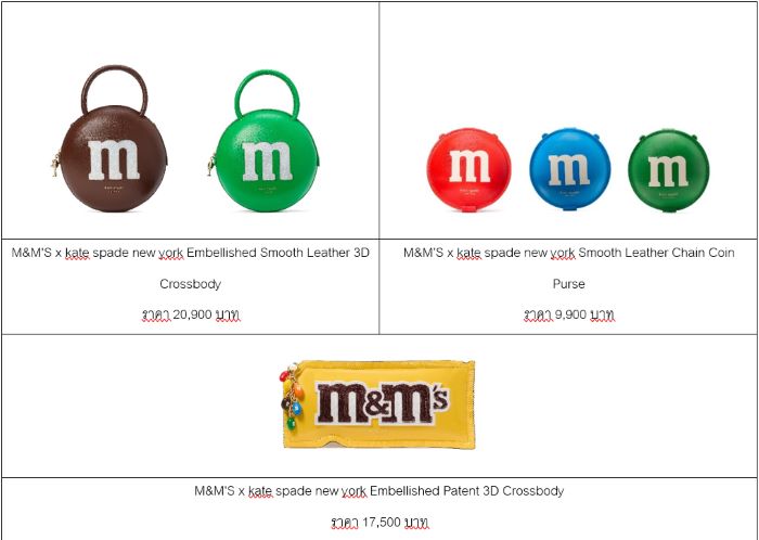 สำหรับ M&M’S x kate spade new york Capsule Collection ประกอบไปด้วยคอลเลกชันกระเป๋าและแอคเซสเซอรี่ที่โดดเด่นอย่างแตกต่าง ทั้งกระเป๋าครอสบอดี้ พวงกุญแจสุดเก๋ และแอคเซสเซอรี่อีกมากมายที่ล้วนได้รับแรงบันดาลใจมาจากรูปทรงสุดไอคอนิกของช็อกโกแลต M&M’S หลากสีสันสะดุดตา พรัอมให้ฉลองปลายปีจัดเต็มแบบตะโกน โชว์ความสดใสเกินต้าน รายล้อมอยู่รอบพื้นที่ประสบการณ์แห่งแฟชั่นนี้ โดยประกาศราคาและช่องทางจัดจำหน่ายแล้ว ดังนี้