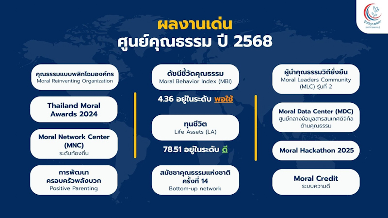 – Moral Leaders Community (MLC) รุ่น 2 พัฒนาผู้นำคุณธรรม 31 คนจาก 5 ภาคส่วน ขับเคลื่อนคุณธรรมเชิงนโยบายและพื้นที่ สร้างเครือข่ายผู้นำระดับชาติ เสริมสร้างชุมชนผู้นำที่เกื้อกูลกันและยั่งยืน โดยมีโครงการต่อยอดจากการอบรม คือ โครงการ 60+ มีงานทำ ล้ำคุณค่า ประกอบด้วย 3 กิจกรรมสำคัญ ได้แก่ (1) Line Open Chat: แพลตฟอร์ม Job Matching ที่เหมาะสมกับผู้สูงวัย (2) MLC 2 ลำดวนชวนชม/ลำดวน ชวนชิม: เชิดชูห้างร้านที่รับผู้สูงอายุเข้าทำงาน และ (3) Sticker Line: ระดมทุนบริจาค สำหรับกองทุนสวัสดิการผู้สูงอายุ โดยจะมีงานเปิดตัวในวันที่ 1 ตุลาคม 2568 นี้