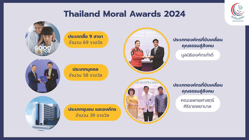 – Thailand Moral Awards 2024 ยกย่องบุคคล องค์กร/ชุมชน และสื่อรวม 166 รางวัล เป็นต้นแบบคุณธรรมและแรงบันดาลใจให้สังคมไทย เติบโตอย่างมีคุณธรรมและยั่งยืน