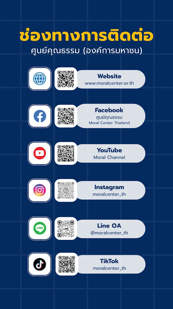สื่อสังคมออนไลน์: Facebook Fan Page ศูนย์คุณธรรม Moral Center Thailand, YouTube: Moral Channel @moralcenter, TikTok: Moral Channel @moralcenter_th, Instagram: Moral Center @moralcenter_th, X (Twitter): ศูนย์คุณธรรม @moralcenter_th และ Line @: ศูนย์คุณธรรม @moralcenter_th