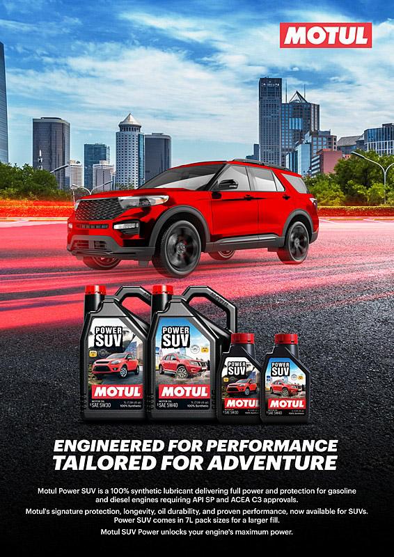 Motul Power SUV เป็นผลิตภัณฑ์ที่โดดเด่น เนื่องจากตอบสนองความต้องการของผู้บริโภคอย่างรอบด้าน โดยออกแบบมาเพื่อรองรับมาตรฐานใหม่ API SP และ ACEA C3 ผลิตภัณฑ์นี้เป็นตัวเลือกที่สมบูรณ์แบบสำหรับรถ SUV ทุกประเภท โมตุลมีความภาคภูมิใจที่ได้พัฒนาผลิตภัณฑ์ Power SUV เพื่อรองรับรถยนต์รุ่นต่างๆ โดยมีให้เลือก 2 ขนาด คือ ขนาด 1 ลิตร และ 7 ลิตร และรองรับทั้งเครื่องยนต์เบนซินและดีเซล ซึ่งแกลลอนขนาด 7 ลิตรคำนึงถึง “ประโยชน์ใช้สอย” ของรถ SUV และรองรับความจุเครื่องยนต์ที่ใหญ่ขึ้น ช่วยให้เดินทางไกลโดยไร้กังวล