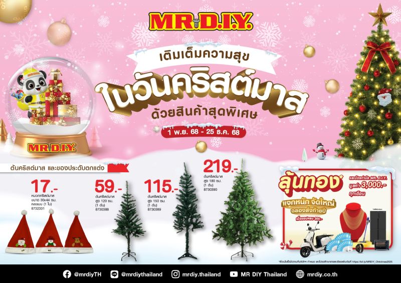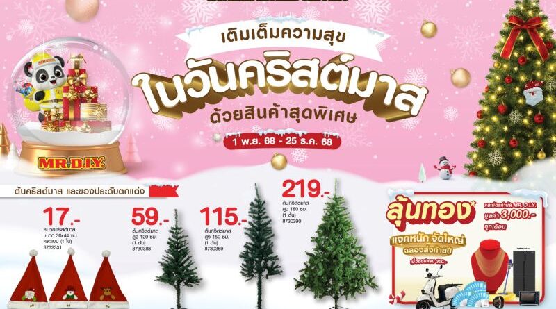 มิสเตอร์. ดี.ไอ.วาย. ผู้นำธุรกิจค้าปลีกอุปกรณ์ตกแต่งบ้านและสินค้าไลฟ์สไตล์ชวนลูกค้าชอปเพลิน “เติมเต็มความสุขในวันคริสต์มาส” ต้อนรับเทศกาลสุดอบอุ่นส่งท้ายปี ด้วยสินค้าคริสต์มาสรวม 210 รายการ ในราคาถูกคุ้มเสมอ (Always Low Prices) ณ ร้านมิสเตอร์. ดี.ไอ.วาย. สาขาที่ร่วมรายการ ตั้งแต่วันที่ 1 พฤศจิกายน 2568 – 25 ธันวาคม 2568
