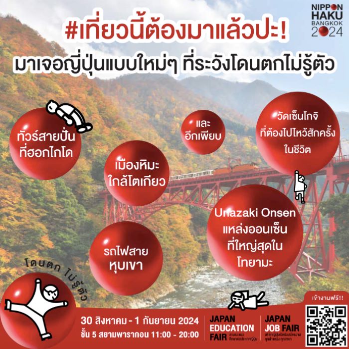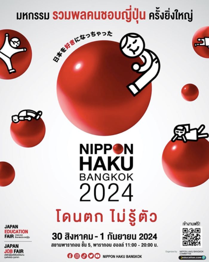 เจเอ็ดดูเคชั่น สถาบันสอนภาษาและศูนย์แนะแนวศึกษาต่อประเทศญี่ปุ่น เตรียมจัดงานมหกรรมเพื่อคนรักญี่ปุ่นแบบครบทุกเรื่องครั้งใหญ่ที่สุดในประเทศไทย กับงาน “NIPPON HAKU BANGKOK 2024” ที่ปีนี้จัดขึ้นเป็นปีที่ 9 กลับมาสร้างความสุขแบบครบทุกมิติ ไม่ว่าคุณจะเป็นด้อมวงการไหนของญี่ปุ่น คุณจะ #โดนตกไม่รู้ตัว อีกครั้ง เตรียมตัวมาฟินกับขบวนกิจกรรมสุดเอ็กซ์คลูซีฟมากมาย พร้อมความบันเทิงที่ยกทัพมาสร้างความสุขแบบจุกๆ ภายในงาน แฟนด้อมเจแปนเตรียมตัวให้พร้อม! งานจัดขึ้น ระหว่างวันที่ 30 สิงหาคม – 1 กันยายน 2567 ณ ชั้น 5 สยามพารากอน