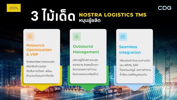 ด้วยเหตุนี้แพลตฟอร์มบริหารจัดการงานขนส่งอัตโนมัติ “NOSTRA LOGISTICS TMS” จึงถือเป็นนวัตกรรมโซลูชันสุดอัจฉริยะที่จะมาตอบโจทย์ และแก้ปัญหางานขนส่งให้แก่พันธมิตรคู่ค้า โดยมุ่งหวังในการส่งมอบประสบการณ์ที่สมบูรณ์แบบ และเป็นตัวช่วยทุกรูปแบบทั้งการบริหารการขนส่งด้วยตนเอง หรือว่าจ้างบริษัทเอาท์ซอร์สขนส่งร่วมด้วยกับ 3 ไม้เด็ด ประกอบด้วย