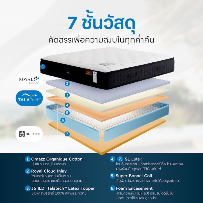 เสริมด้วยความนุ่มนวลดุจนอนบนปุยเมฆกับนวัตกรรม Royal Cloud Inlay ชั้นโฟมออร์แกนิกหนาหนุ่ม ที่สามารถโอบอุ้มสรีระให้รู้สึกผ่อนคลาย