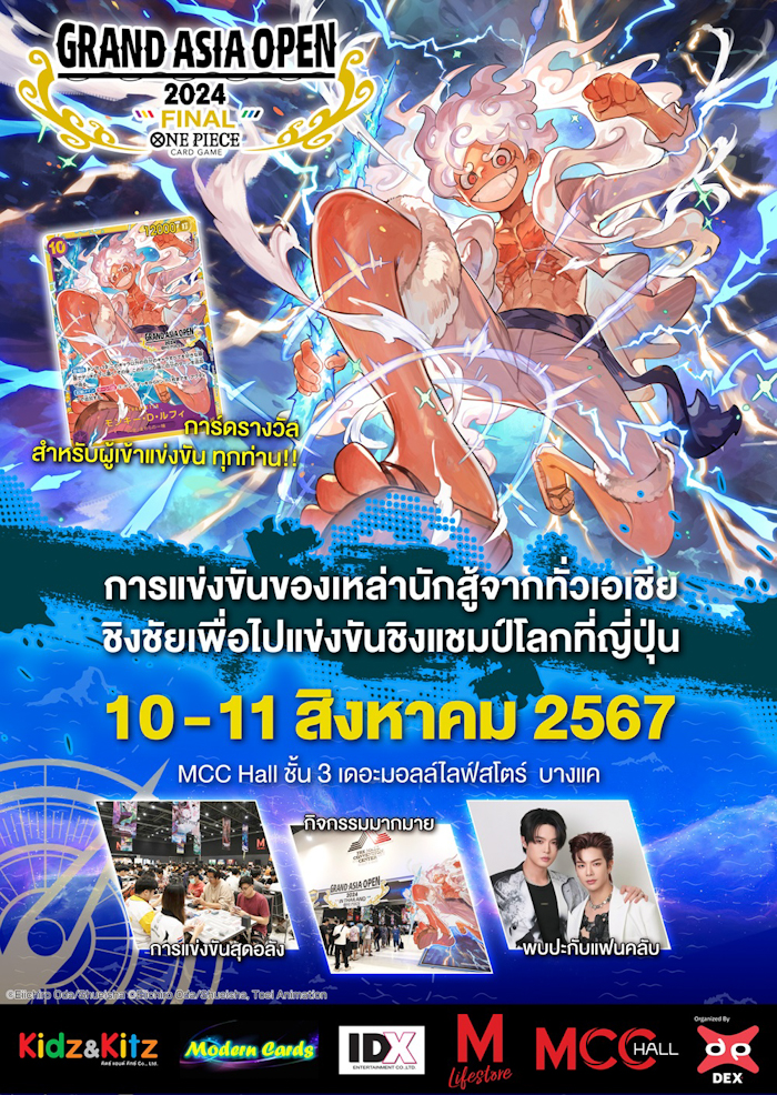 แฟนๆ One Piece และ Card Game Players ทั้งหลาย เตรียมตัวและเตรียมใจ ร่วมลุ้นระทึกครั้งใหญ่ กับการแข่งขัน “วันพีซการ์ดเกม” สุดยิ่งใหญ่แห่งปี กับงาน “One Piece Card Game Grand Asia Open 2024 Finals” การแข่งชิงแชมป์เอเชีย สู่รอบ Championship 2024 World Final โดยงานนี้ บริษัท คิดซ์ แอนด์ คิทซ์ จำกัด ผู้แทนจำหน่ายและผลิต Card Game ลิขสิทธิ์แท้จากญี่ปุ่น พร้อมด้วย บริษัท บันได จำกัด (ประเทศญี่ปุ่น) ร่วมกันจัดขึ้น เพื่อเป็นการเฟ้นหาตัวแทนนักแข่ง One Piece Card Game ในระดับเอเชีย เพื่อเตรียมแข่งขันชิงแชมป์โลกรอบสุดท้าย