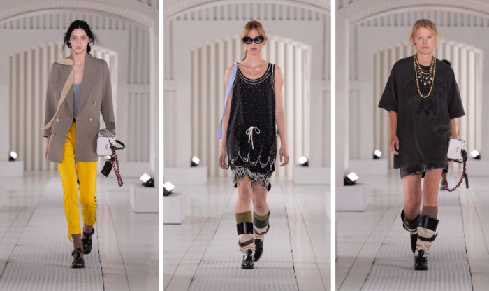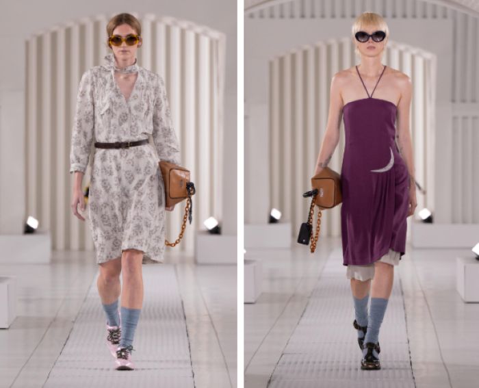 เสื้อเชิ้ตผ้าเนื้อย่น เสื้อเบลาส์ และเดรส ถ่ายทอดกลิ่นอายวินเทจอย่างมีเสน่ห์ ส่วนเดรสที่เป็นภาพจำลองจากบอดี้สูท ถูกจับเลเยอร์ทับบนกางเกงคูลอตต์ทรงพอง สร้างความไม่สมมาตรที่เหนือความคาดหมาย สำหรับเสื้อแจ็กเก็ตพาร์กามีการเลือกใช้ผ้าทอเนื้อแน่น จับคู่กับเสื้อกล้ามถักลายทางและกางเกงขาสั้น