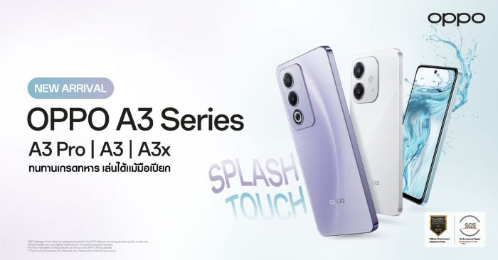 OPPO วางจำหน่ายสมาร์ตโฟน A3 Series ใหม่ล่าสุดเอาใจสายบันเทิง “OPPO A3 Pro 5G” และ “OPPO A3x” มาพร้อมสโลแกน “สวยเก่งเกรด A” อัดแน่นฟีเจอร์ทั้งความบันเทิง และความทนทานแบบจัดเต็ม โดย OPPO A3 Pro วางจำหน่ายในราคาเริ่มต้น 7,999 บาท และ OPPO A3x วางจำหน่ายในราคาเริ่มต้นเพียง 3,999 บาท พร้อมจัดงาน “OPPO A3 Series Mission Day” พา OPPO Family อย่าง “ไมกี้ ปณิธาน” และ “หลิงหลิง ศิริลักษณ์ – ออม กรณ์นภัส” เสริมทัพด้วยคู่จิ้นสุดฟิน “บิ๊ก ธนกร – ปาร์ค อนันตเดช” พกความสดใสมาแชร์ความสนุกในงานกันแบบจัดเต็ม