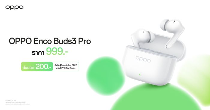 OPPO Enco Buds3 Pro หูฟังไร้สายแบตอึดใช้งานได้ตลอดวัน ดีที่สุดในราคาระดับเดียวกัน พร้อมมอบประสบการณ์ทำนองที่ไม่เคยหลับใหล ใช้งานได้ยาวนาน 54 ชั่วโมง แบตเตอรี่ทนทานพิเศษ ได้รับการรับรองสุขภาพแบตเตอรี่จาก TÜV Rheinland พร้อมลุยทุกการผจญภัย ทนทาน กันน้ำ กันฝุ่นมาตรฐาน IP55 ไดรเวอร์ขนาดใหญ่พิเศษ 12.4 มม. มอบเสียงทรงพลัง อีกทั้งยังมี Enco Master Equalizer พร้อมตัวปรับแต่งเสียงส่วนบุคคล ปรับแต่งด้วยโหมด Clear Vocals, Bass Boost หรือ Original Sound เพื่อค้นหาเสียงที่สมบูรณ์แบบสำหรับทุกช่วงเวลา เชื่อมต่อเสถียรด้วยการส่งสัญญาณ Bluetooth 5.4 พร้อมความหน่วงต่ำพิเศษ 94ms พร้อมโหมดเกมเหมาะสำหรับเกมเมอร์และสตรีมเมอร์ สั่งงานผ่านหูฟังด้วย Smart Touch Control ควบคุมกล้องด้วยการแตะสองครั้ง สะดวกสบายมากขึ้นด้วย AI Assistant โต้ตอบได้ทันที โดยไม่ต้องสัมผัสอุปกรณ์ เชื่อมต่อกับอุปกรณ์ได้ 2 เครื่องพร้อมกันได้ง่ายดายด้วย Dual Connection มาพร้อม Google Fast Pair จับคู่กับอุปกรณ์ง่ายขึ้นสำหรับผู้ใช้ Android และมาพร้อมสองสีสุดคลาสสิค คือ สีขาว Glaze White และสีเทา Graphite Grey ในราคาเพียง 999 บาท