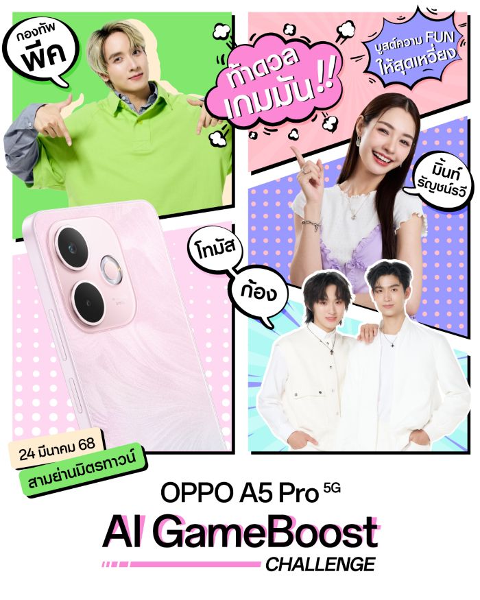 นอกจากนี้ เตรียมตัวให้พร้อมแล้วมาตอกย้ำความแรง ร่วมทดสอบประสิทธิภาพในงาน OPPO A5 Pro 5G AI GameBoost Challenge ท้าดวลเกมมันส์ บูสต์ความ FUN ให้สุดเหวี่ยง ยกทัพมาพร้อมกับ “กองทัพ พีค”, “มิ้นท์ รัญชน์รวี”, “โทมัส ธีร์ทัศน์” และ “ก้อง ก้องภพ” พร้อมมอบความสนุกสุดมัน ณ ลานหน้าสามย่านมิตรทาวน์ วันที่ 24 มีนาคมนี้!