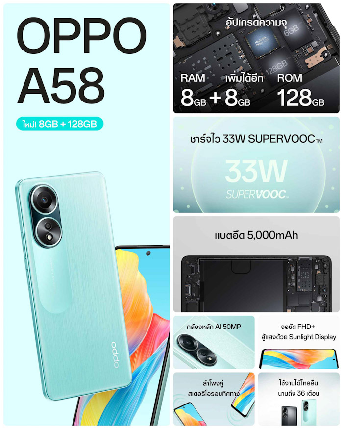 ใหม่! OPPO A58 สมาร์ตโฟนน้องเล็กพร้อมอัปความจุให้ใช้งานได้เต็มพิกัดทุกความบันเทิงกว่าที่เคยด้วยการอัปเกรดความจุใหม่ RAM 8GB เพิ่มหน่วยความจำได้อีก 8GB พร้อม ROM 128GB จากเดิม RAM 6GB พร้อมตอบโจทย์ทุกเอ็นเตอร์เทนได้มากกว่าที่เคย ไม่ว่าจะดูหนัง ฟังเพลง หรือเล่นเกมก็ใช้งานได้อย่างลื่นไหล ใช้งานได้แบบไม่มีสะดุดด้วยชาร์จไว 33W SUPERVOOC และแบตเตอรี่ใหญ่ 5,000mAh
