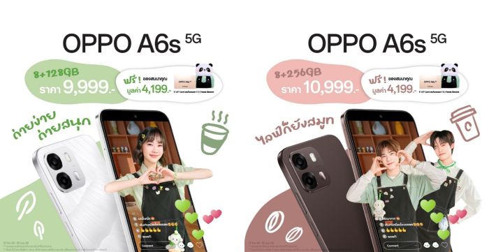 OPPO ประกาศวางจำหน่ายอย่างเป็นทางการในประเทศไทยแล้วกับ “OPPO A6s 5G” รุ่นใหม่ล่าสุดจากตระกูลซีรีส์ A ที่มาภายใต้สโลแกน “A Step Ahead” สมาร์ตโฟนเพื่อนคู่ใจ ตอบโจทย์ทุกการใช้งาน มาพร้อม 2 ความจุ ได้แก่ OPPO A6s 5G (8+128GB) ในราคาเพียง 9,999 บาท และ OPPO A6s 5G (8+256GB) ในราคาเพียง 10,999 บาท พิเศษยิ่งกว่านั้น เมื่อซื้อภายในวันนี้ ถึง 30 เมษายน 2569 นี้ จะได้รับประกันจอแตก จํานวน 1 ครั้ง ภายในระยะเวลา 1 ปี (นับจากวันที่ซื้อเครื่อง) และ Panda Blanket จำนวน 1 ผืนมูลค่า 1,199 บาท