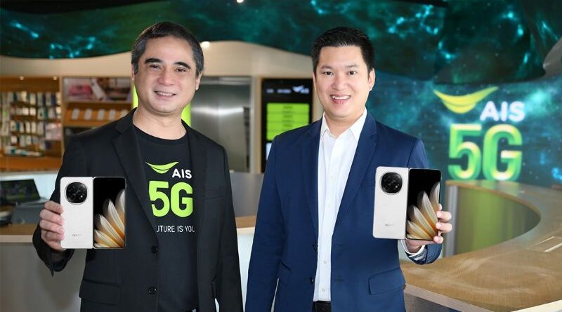 OPPO นำโดย คุณชานนท์ จิรายุกุล ประธานกรรมการอาวุโสฝ่ายบริหาร ออปโป้แห่งประเทศไทย (ขวา) จับมือกับพันธมิตร คุณศรัณย์ ผโลประการ หัวหน้าฝ่ายงานผลิตภัณฑ์โทรศัพท์เคลื่อนที่ กลุ่มลูกค้าทั่วไป AIS (ซ้าย) เปิดตัว OPPO Find N5 สมาร์ตโฟนจอพับที่บางที่สุด ยกระดับความทรงพลังในทุกมิติ พร้อมร่วมมือกับ AIS มอบประสบการณ์ความเร็วแรงของสัญญาณอินเทอร์เน็ต กับเทคโนโลยีใหม่ AIS 5G+ NRCA ให้คุณดาวน์โหลด อัปโหลดข้อมูลได้รวดเร็ว และเสถียรยิ่งขึ้น พร้อมข้อเสนอและราคาสุดพิเศษเมื่อสั่งซื้อ OPPO Find N5 ผ่าน AIS