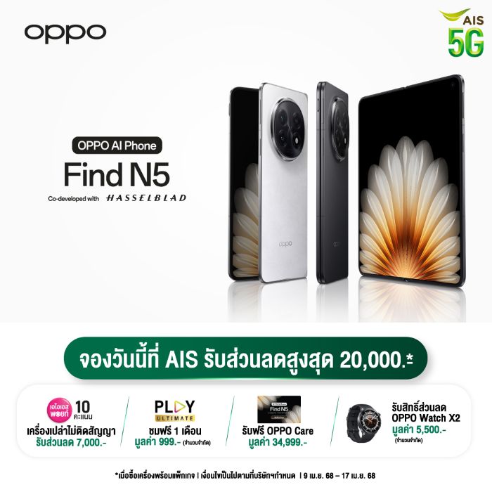 โดย OPPO Find N5 สมาร์ตโฟนจอพับที่บางที่สุด ยกระดับความทรงพลังในทุกมิติ มาพร้อมกับราคาสุดพิเศษจาก AIS ซื้อเครื่องพร้อมแพ็กลดสูงสุด 20,000 บาท จองเป็นเจ้าของได้แล้วตั้งแต่วันนี้ – 17 เมษายน 2568 ที่ AIS Shop, Telewiz ทุกสาขา และทาง AIS Online Store