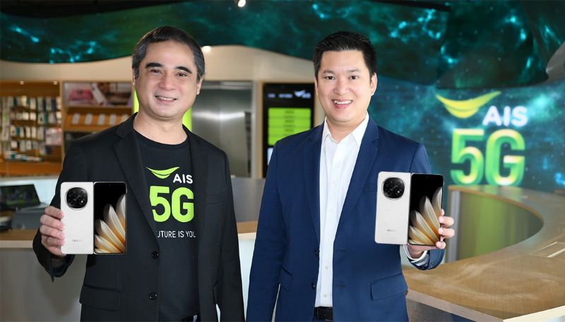OPPO นำโดย คุณชานนท์ จิรายุกุล ประธานกรรมการอาวุโสฝ่ายบริหาร ออปโป้แห่งประเทศไทย (ขวา) จับมือกับพันธมิตร คุณศรัณย์ ผโลประการ หัวหน้าฝ่ายงานผลิตภัณฑ์โทรศัพท์เคลื่อนที่ กลุ่มลูกค้าทั่วไป AIS (ซ้าย) เปิดตัว OPPO Find N5 สมาร์ตโฟนจอพับที่บางที่สุด ยกระดับความทรงพลังในทุกมิติ พร้อมร่วมมือกับ AIS มอบประสบการณ์ความเร็วแรงของสัญญาณอินเทอร์เน็ต กับเทคโนโลยีใหม่ AIS 5G+ NRCA ให้คุณดาวน์โหลด อัปโหลดข้อมูลได้รวดเร็ว และเสถียรยิ่งขึ้น พร้อมข้อเสนอและราคาสุดพิเศษเมื่อสั่งซื้อ OPPO Find N5 ผ่าน AIS
