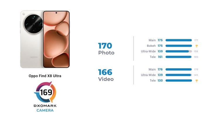 OPPO Find X8 Ultra คว้าแชมป์สมาร์ตโฟนกล้องอันดับ 1 จาก DXOMARK ตอกย้ำความเป็นผู้นำด้านเทคโนโลยีกล้องระดับโลก โดยรุ่น OPPO Find X8 Ultra ได้คะแนนรวมสูงถึง 169 คะแนน ครองอันดับ 1 บนตารางจัดอันดับล่าสุด