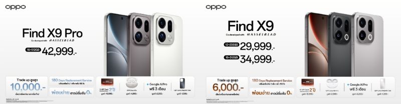 เป็นเจ้าของ OPPO Find X9 Series ได้แล้ววันนี้ โดย OPPO Find X9 Pro มาพร้อมความจุ 16+512GB ใน 2 สี ได้แก่ สีขาว Silk White และสีเทา Titanium Charcoal ในราคา 42,999 บาท ส่วน OPPO Find X9 มีให้เลือกสองรุ่นความจุ 12+256GB และ 16+512GB พร้อมมีให้เลือก 2 สี ได้แก่ สีเทา Titanium Grey และสีดำ Space Black ราคาเริ่มต้นที่ 29,999 บาท เปิดจำหน่ายพร้อมกันทั่วประเทศ ณ OPPO Brand Shop ทุกสาขาและตัวแทนจำหน่ายทั่วประเทศ พร้อมโปรโมชั่นสุดพิเศษช่วงเปิดตัว