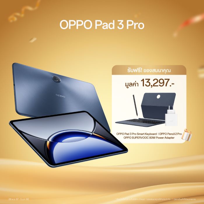 OPPO Pad 3 Pro แท็บเล็ตแฟลกชิปรุ่นล่าสุด ภายใต้แนวคิด “เหนือกว่าทุกการสร้างสรรค์” โดดเด่นด้วยขุมพลัง Snapdragon 8 Gen 3 Mobile Platform Leading Version หน้าจอ ReadFit 3K 144Hz คมชัดลื่นไหล พร้อมลำโพงสเตอริโอ 8 ตัว ให้เสียงสมจริงดื่มด่ำ ใช้งานได้ยาวนานด้วยชาร์จไว 67W SUPERVOOC โดยเมื่อซื้อ OPPO Pad 3 Pro ในราคา 29,999 บาท รับทันที! OPPO Pad 3 Pro Smart Keyboard, OPPO Pencil 2 Pro และ OPPO SUPERVOOC 80W Power Adapter รวมมูลค่า 13,297 บาท