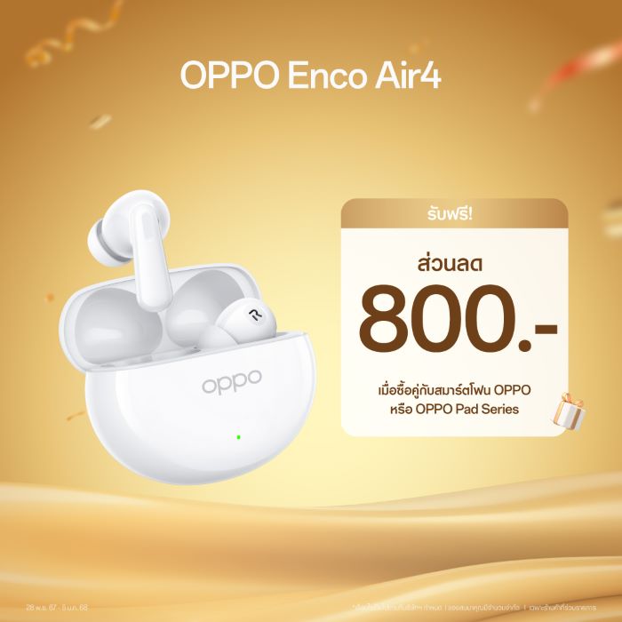 OPPO Enco Air4 หูฟังไร้สายตัดเสียงรบกวนที่ดีที่สุดในระดับเดียวกัน ตัดเสียงรบกวนปรับอัตโนมัติได้สูงสุด 32dB ให้เสียงคมชัด หลงใหลไปทุกมิติเสียงด้วยไดร์เวอร์ขนาดใหญ่พิเศษ 12.4 มม. เชื่อมต่อเสถียรด้วย Bluetooth 5.4 และใช้งานต่อเนื่องนานถึง 43 ชั่วโมง โดยเมื่อซื้อ OPPO Enco Air4 ในราคา 1,999 บาท รับฟรีทันที! ส่วนลด 800 บาท เมื่อซื้อคู่กับสมาร์ตโฟน OPPO หรือ OPPO Pad Series