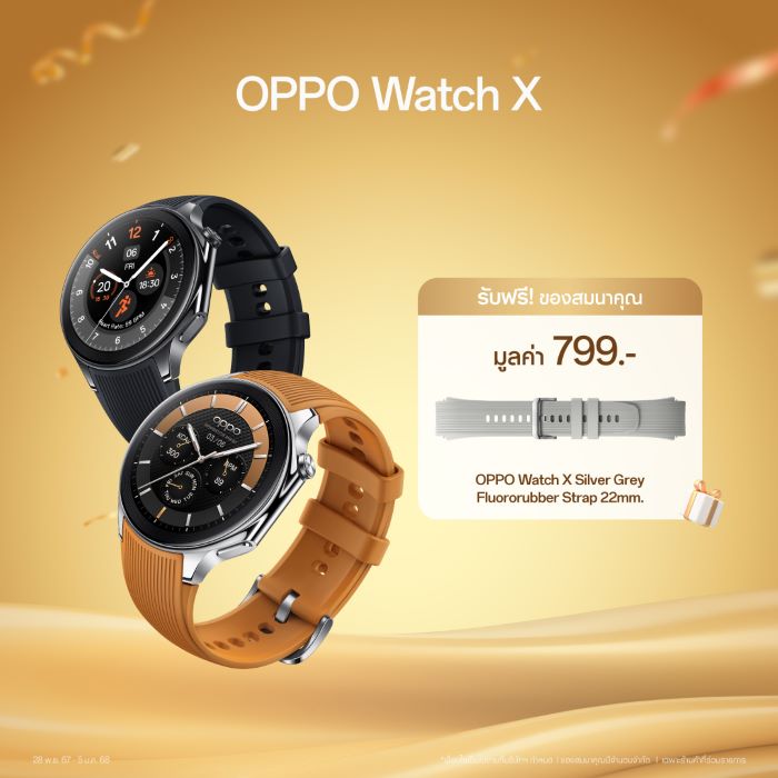สมาร์ทวอทช์ระดับแฟลกชิปทรงพลังมาพร้อม Exclusive Sport Mode โหมดกีฬาเฉพาะทาง เพื่อการออกกำลังกายอย่างมืออาชีพ เหมือนมีผู้ช่วยมือโปรส่วนตัว พร้อมด้วย GPS ความถี่คู่ แทร็คการวิ่งแม่นยำทุกเส้นทาง และโหมดกีฬากว่า 100 โหมด เล่นกีฬาได้หลากหลาย ใช้งานได้ยาวนานด้วยแบตเตอรี่ใช้ต่อเนื่องสูงสุด 100 ชั่วโมง พร้อมชาร์จไว มาพร้อมดีไซน์พรีเมียมด้วยตัวเรือนสแตนเลสหน้าปัดคริสตัสแซฟไฟร์ระดับแฟลกชิป เชื่อมต่อสะดวกด้วย WearOS system ซิงค์ Google สะดวกเข้าถึงทุกการใช้งาน โดยเมื่อซื้อ OPPO Watch X ในราคา 11,990 บาท รับฟรีทันที! OPPO Watch X Silver Grey Fluororubber Strap 22mm. รวมมูลค่า 799 บาท