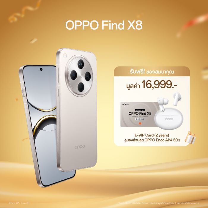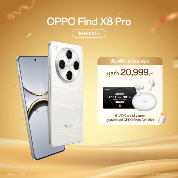OPPO Find X8 Pro สมาร์ตโฟนมาตรฐานแฟลกชิปที่เหนือกว่า ครั้งแรกของโลกกับกล้อง Periscope Telephoto คู่ กับประสบการณ์ซูมที่ดีที่สุดด้วย AI Telescope Zoom ซูมด้วยพลัง AI ไกล 120 เท่า พร้อม Hasselblad Portrait Mode ถ่ายภาพบุคคลได้คมชัด และแม่นยำมากขึ้น โดยเมื่อซื้อ OPPO Find X8 Pro (16+512GB) ในราคา 39,999 บาท รับทันที! E-VIP Card (2 ปี) และคูปองส่วนลด OPPO Enco Air4 50% รวมมูลค่า 20,999 บาท