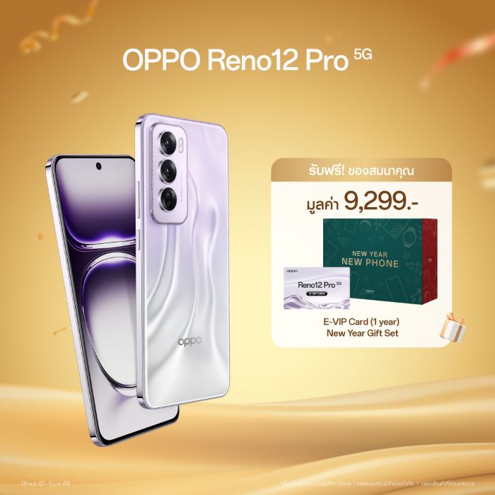 OPPO Reno12 Pro 5G มาพร้อมกับความสามารถที่ช่วยให้ถ่ายรูปพอร์ตเทรตแบบมือโปรด้วย AI Portrait กับฟีเจอร์ที่อัปเกรด อย่างยางลบ AI 2.0 รีทัชเนียนด้วย AI ลบคนและวัตถุได้พร้อมกันในคลิกเดียว ไม่พลาดทุกโมเมนต์สำคัญในการถ่ายรูปด้วย AI Best Face ซ่อมรูปพังให้ปัง ทนทานรอบด้าน กันกระแทก กันน้ำ ชาร์จไว แบตจุใจ โดยเมื่อซื้อ OPPO Reno12 Pro 5G ในราคา 19,999 บาท รับทันที! E-VIP Card (1 ปี) และ New Year Gift Set สุดพิเศษ รวมมูลค่า 9,299 บาท