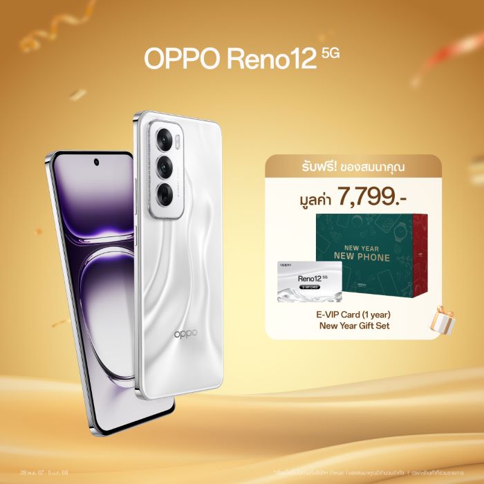 OPPO Reno12 5G เป็น OPPO AI แบบเต็มรูปแบบเครื่องแรกที่ดีที่สุดสำหรับคนรุ่นใหม่ที่ผสานรวมเทคโนโลยีล้ำสมัย ยกระดับการถ่ายภาพพอร์ตเทรต มาพร้อมดีไซน์อันน่าทึ่ง และพลังแห่ง OPPO AI เข้าไว้ด้วยกัน อีกทั้งยังทนทานรอบด้าน กันน้ำ กันฝุ่น ชาร์จไว และแบตจุใจ โดยเมื่อซื้อ OPPO Reno12 5G (12+256GB) ราคา 14,999 บาท หรือ OPPO Reno12 5G (12+512GB) ราคา 16,999 บาท รับทันที! E-VIP Card (1 ปี) และ New Year Gift Set สุดพิเศษ รวมมูลค่า 7,799 บาท
