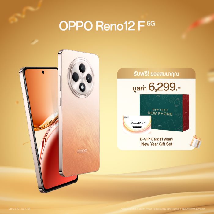 OPPO Reno12 F 5G สมาร์ตโฟน OPPO AI Phone รุ่นเริ่มต้น มอบประสบการณ์เล่นเกมเต็มอรรถรส พร้อมเทคโนโลยีสุดล้ำที่เชื่อมต่อกับสัญญาณได้อย่างเสถียรและรวดเร็วด้วย AI LinkBoost มาพร้อมจอแสดงผลปรับอัจฉริยะ 120Hz มอบประสบการณ์การเล่นเกมแบบจัดเต็มกับดีไซน์ Cosmos Ring และ Halo Light วงแหวนไฟรอบกล้อง ที่สุดของความทนทาน โดยเมื่อซื้อ OPPO Reno12 F 5G ในราคา 11,999 บาท รับทันที! E-VIP Card (1 ปี) และ New Year Gift Set สุดพิเศษ รวมมูลค่า 6,299 บาท