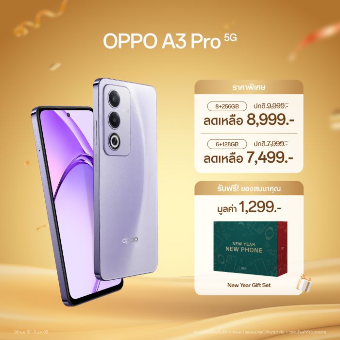 OPPO A3 Pro 5G สมาร์ตโฟนสวย เก่ง เกรด A จากตระกูลซีรีส์ A สมาร์ตโฟนที่ตอบโจทย์ทุกความต้องการของผู้ใช้งาน โดยเฉพาะสายบันเทิงและคนที่ชอบความทนทานพร้อมมอบประสบการณ์ใช้งานที่คุ้มค่ากว่าและราคาที่คุ้มค่ายิ่งขึ้น โดยเมื่อซื้อ OPPO A3 Pro 5G (8+256GB) ในราคาพิเศษ 8,999 บาท จากปกติราคา 9,999 บาท และ OPPO A3 Pro 5G (6+128GB) ในราคาพิเศษลดเหลือ 7,499 บาท จากปกติราคา 7,999 บาท รับฟรีทันที! New Year Gift Set มูลค่า 1,299 บาท