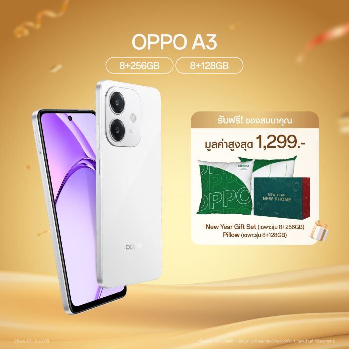 OPPO A3 สมาร์ตโฟนสวย เก่ง เกรด A จากตระกูลซีรีส์ A สมาร์ตโฟนเอาใจสายโหด พร้อมกับความสนุกไปอีกขั้น ทำให้คุณได้รับประสบการณ์ด้านความบันเทิงได้อย่างเต็มที่ สุดยอดความทนทาน ทนต่อแรงกระแทกระดับทหาร การป้องกันของเหลวหลายชนิด และ Splash Touch สนุกไม่สะดุดแม้หน้าจอเปียก แบตเตอรี่สุดอึดพร้อมตอบโจทย์ทุกความต้องการ โดยเมื่อซื้อ OPPO A3 (8+128GB) ในราคา 5,999 บาท หรือ OPPO A3 (8+256GB) ในราคา 6,999 บาท รับทันที! New Year Gift Set (เฉพาะรุ่น 8+256GB) และ Pillow (เฉพาะรุ่น 8+128GB) มูลค่าสูงสุด 1,299 บาท
