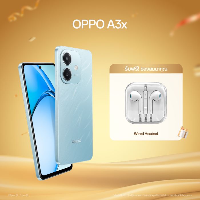 OPPO A3x สมาร์ตโฟนสวย เก่ง เกรด A สมาร์ตโฟนที่ตอบโจทย์ทุกความต้องการของผู้ใช้งาน โดยเฉพาะสายบันเทิงและคนที่ชอบความทนทานพร้อมมอบประสบการณ์ใช้งานที่คุ้มค่ากว่าและราคาที่คุ้มค่ายิ่งขึ้น โดยเมื่อซื้อ OPPO A3x ในราคาเริ่มต้น 3,999 บาท รับฟรีทันที! Wired Headset