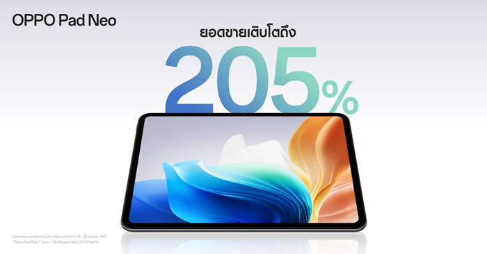 วางจำหน่ายแล้ววันนี้ “OPPO Pad Neo” เปิดตัวแรง กระแสตอบรับดีเยี่ยมกวาดยอดขายพุ่งสูงขึ้นถึง 205% ตั้งแต่สัปดาห์แรกที่เริ่มวางจำหน่าย ตั้งแต่วันที่ 23 – 29 มกราคม 2567 เมื่อเทียบกับรุ่นก่อน