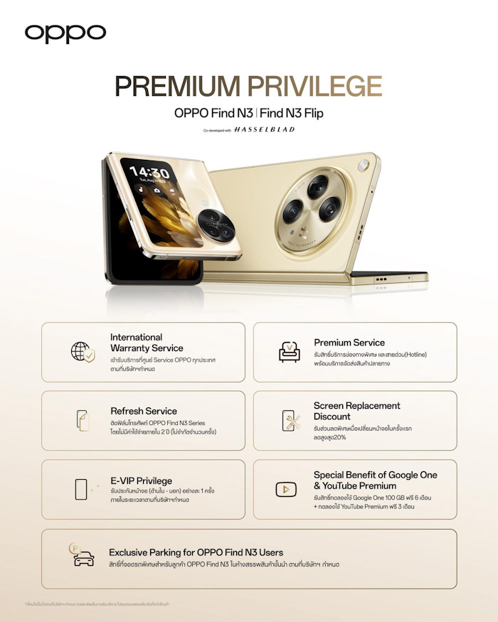 - Exclusive Parking for OPPO Find N3 Users สิทธิ์จอดรถพิเศษสำหรับลูกค้า OPPO Find N3 ในห้างสรรพสินค้าชั้นนำ ตามที่บริษัทฯ กำหนด