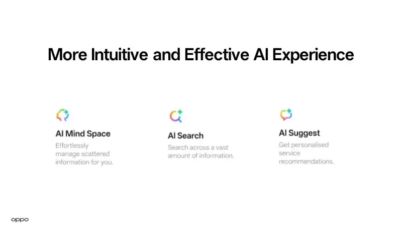 ฟีเจอร์ AI Mind Space พัฒนาขึ้นด้วยเทคโนโลยี Google Gemini เพื่อให้สามารถตอบคำถามแบบเฉพาะตัวบุคคลโดยอ้างอิงจากข้อมูลที่บันทึกไว้ในอุปกรณ์ นอกจากนี้ OPPO ยังได้ร่วมมือกับ Google Cloud พัฒนาเทคโนโลยี AI Search ให้มีประสิทธิภาพมากขึ้น ช่วยให้ระบบเข้าใจภาษาธรรมชาติได้ดีกว่าเดิม ทำให้ผู้ใช้งานสามารถค้นหาข้อมูลข้ามแอปพลิเคชันต่าง ๆ ได้อย่างราบรื่นด้วยภาษาพูดที่ใช้ในชีวิตประจำวัน เพื่อให้คาดการณ์ความต้องการของผู้ใช้ได้อย่างแม่นยำ AI Suggest ผสมผสานบริบทปัจจุบันจากตัวเครื่องเข้ากับข้อมูลในหน่วยความจำ เพื่อสร้างโปรไฟล์ผู้ใช้ที่มีการปรับเปลี่ยนอยู่เสมอ ช่วยให้สามารถนำเสนอคำแนะนำล่วงหน้าได้อย่างเหมาะสม และทันท่วงที