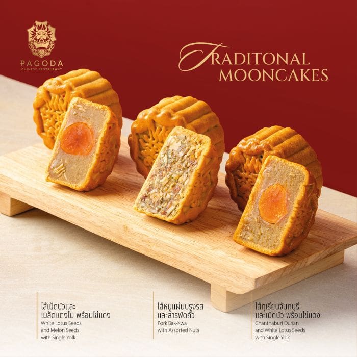 ทีมเชฟจากห้องอาหารพาโกด้า ไชนีส เรสเตอรองท์ นำโดยเชฟออสก้า ปัน ได้รังสรรค์ขนมไหว้พระจันทร์ทั้งหมด 6 รสชาติ โดยแบ่งเป็น: