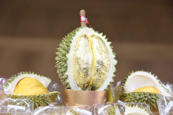 • ทุเรียนพันธุ์มูซังคิงทองคำ เป็นการนำทุเรียนสายพันธุ์มูซังคิงที่มีรสชาติที่หวาน หอม เนื้อเนียน ละเอียด มีกลิ่นเฉพาะตัว มาหุ้มด้วยทองคำบริสุทธิ์ (Food grade) เป็นทองที่สามารถนำมาทำอาหารรับประทานได้ แปะลงไปบนเนื้อทุเรียน