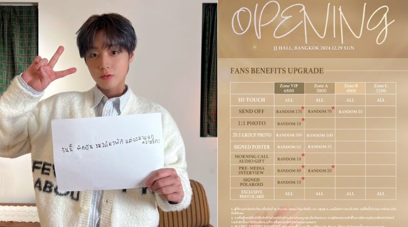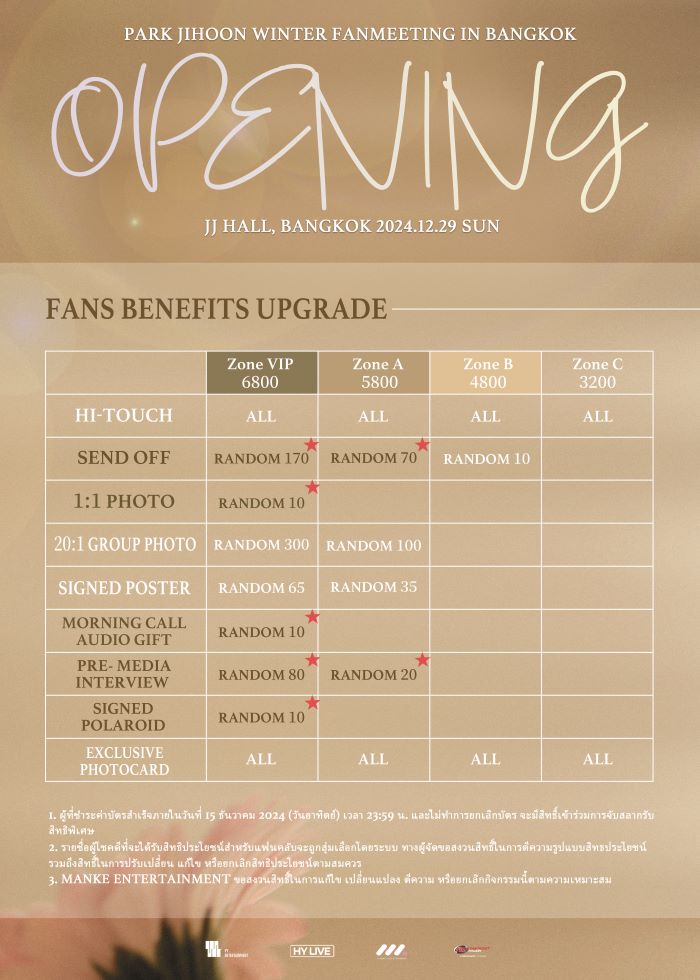 หนุ่มพัคจีฮุน ฝากบอกเมย์ไทยทุกคนว่า “วันนี้พัคฮุน ไม่ได้มาพัก แต่จะมาแจกความรัก!” แถมเตรียมของขวัญสุดพิเศษต้อนรับเทศกาลคริสต์มาสปีนี้ โปรโมชั่นสุดพิเศษสำหรับบัตร fan meeting ❄PARK JIHOON WINTER FAN MEETING ‘OPENING’ IN BANGKOK❄ เมื่อซื้อบัตรตั้งแต่3ใบขึ้นไป จะสามารถซื้อบัตรได้ในราคาสุดพิเศษ: VIP:฿6200, ZoneA:฿5000, ZoneB: ฿4000, ZoneC:฿2800 เมย์ไทยคนไหนที่ยังไม่มีบัตรให้รีบจองด่วน