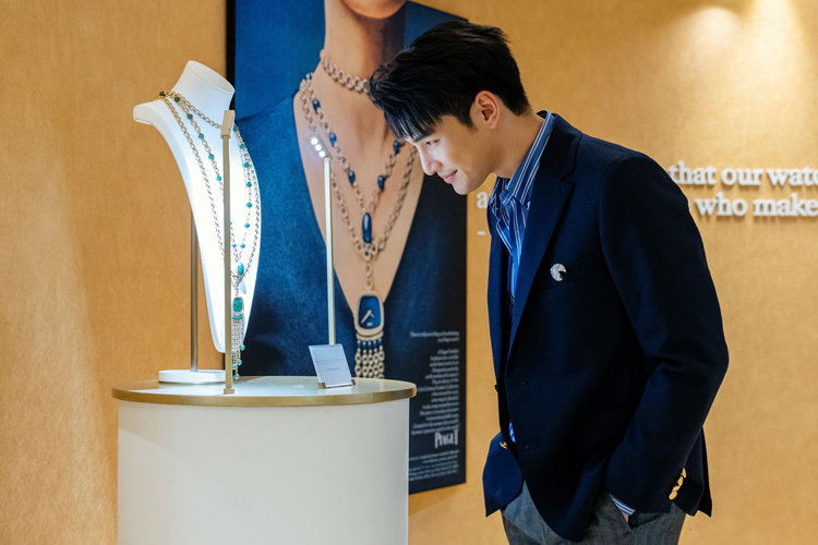 อาโป-ณัฐวิญญ์ เลือกสวมเครื่องประดับชั้นสูงอย่าง สร้อยคอ Generous Laces และ นาฬิกา Altiplano Precious Skeleton หนึ่งในเรือนเวลาไฮจิวเวลรี่หน้าปัดเปลือยที่บางที่สุด ณ ขณะนี้ กลไกถูกตกแต่งอย่างพิถีพิถันด้วยเพชรบริลเลียนต์คัตและแซฟไฟร์สีน้ำเงิน